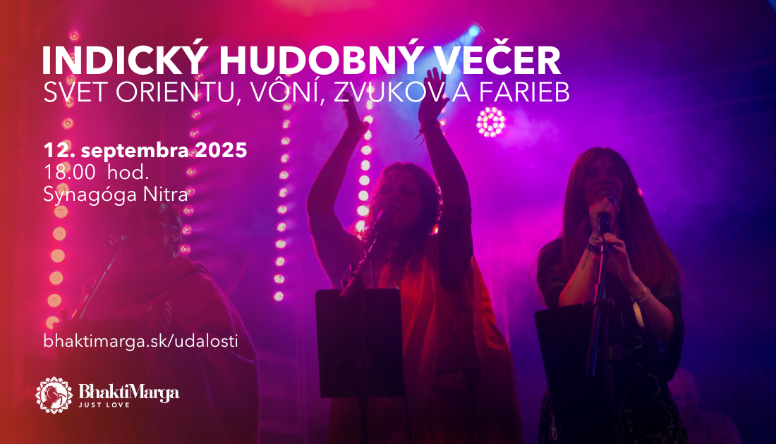 Vojdite na pár hodín do sveta orientu. Nadýchajte sa atmosféry vôní, zvukov, farieb. Krása indickej kultúry a jej posolstva lásky, spolupatričnosti a jednoty nech pohladí vaše srdcia, upokojí myseľ. Ponúkame vám večer plný radostných živelných piesní, ale aj hlbokých mocných mantier v pradávnom pôvodnom jazyku sanskrite a indických rág.