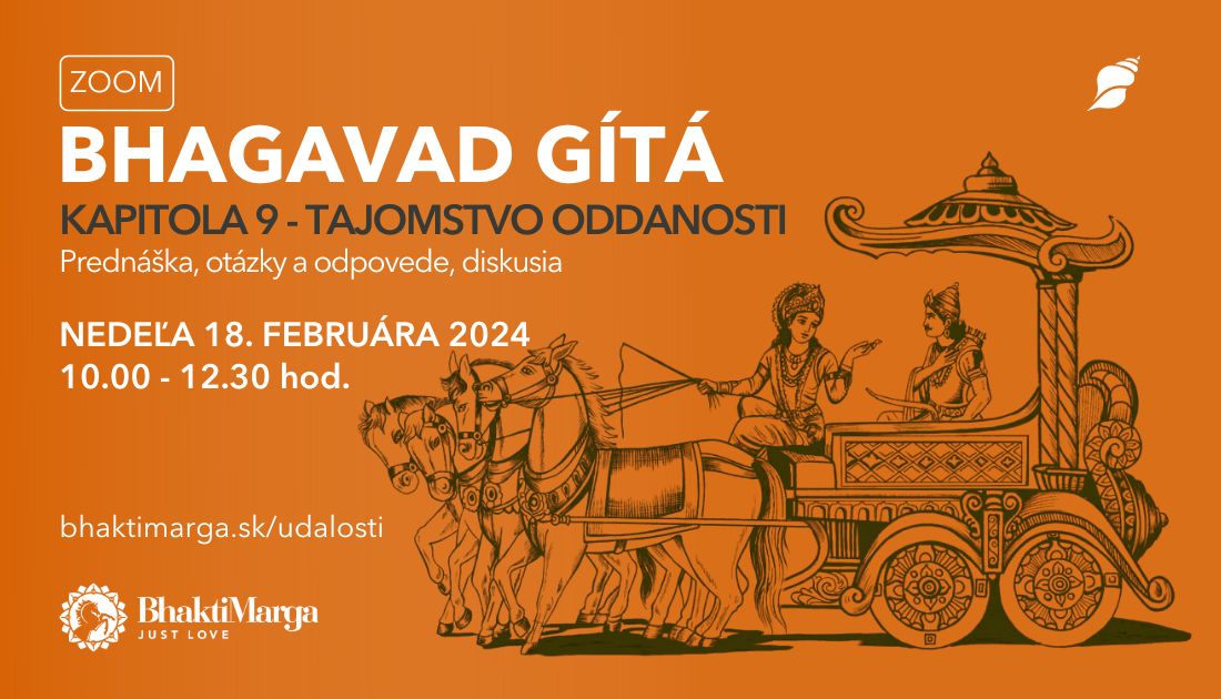 Toto poznanie je aktuálne aj v súčasnom svete, v súčasných podmienkach, pre súčasných ľudí. Pozývame vás na spoločné prechádzanie jednotlivými kapitolami Bhagavad Gíty s komentármi Paramahamsu Vishwanandu. Každý mesiac si prejdeme jednu kapitolu. Veľkou výhodou pre každého bude, ak bude mať danú kapitolu prečítanú. Môžete si tiež pripraviť svoje otázky, ktoré potrebujete zodpovedať alebo si vyjasniť. Vítaní sú, samozrejme, aj tí, ktorí ju ešte nečítali.