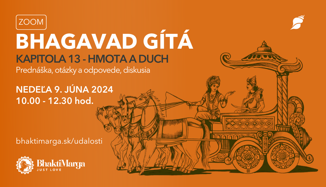 Prednáška, otázky a odpovede, diskusia Pred tisíckami rokov bolo na obrovskom bojovom poli uprostred chaosu, neistoty a strachu ľudstvu dané najvyššie poznanie, známe ako Bhagavad Gítá. Toto poznanie je aktuálne aj v súčasnom svete, v súčasných podmienkach, pre súčasných ľudí. Pozývame vás na spoločné prechádzanie jednotlivými kapitolami Bhagavad Gíty s komentármi Paramahamsu Vishwanandu. Každý mesiac si prejdeme jednu kapitolu. […]
